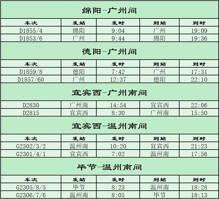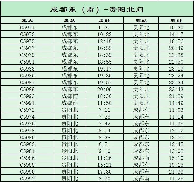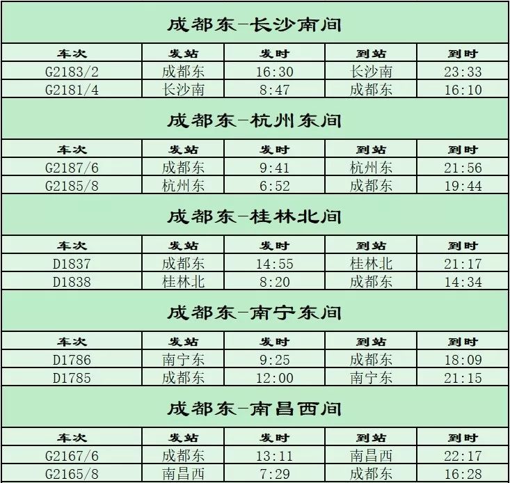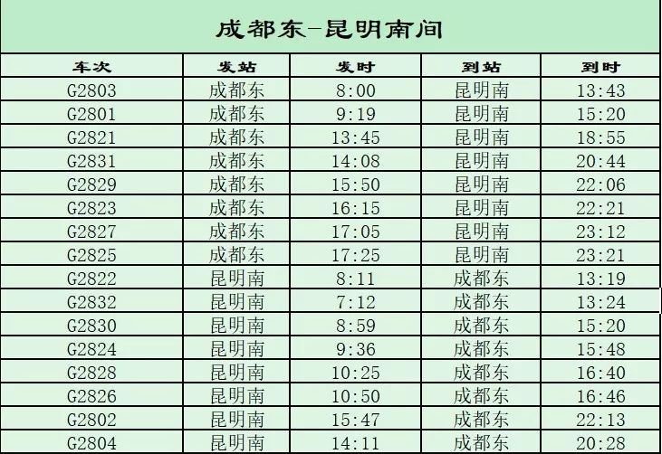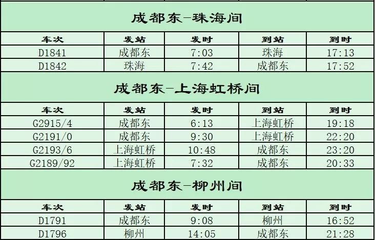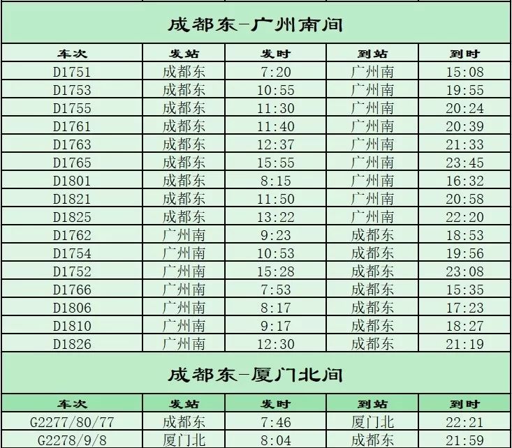 二、成都至广州新增9趟直达动车组,成都至昆明新增8对直达动车组