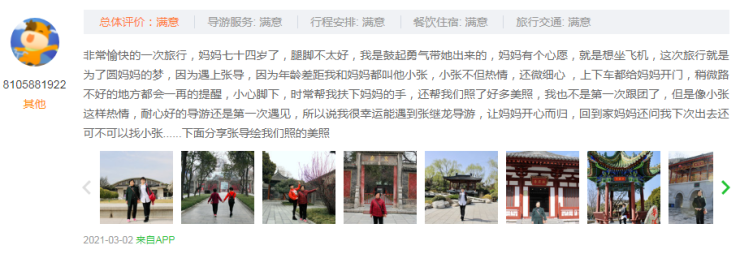文化底蕴深厚的古都西安,是许多长辈心仪的旅游目的地,在张继龙接待的客人中,不乏与自己父母年龄相仿的客人。途牛西安方向的线路评价中,许多客人对“小张导游”的服务赞不绝口,3月上旬,有一条评价来自一位与74岁母亲一同出游的客人,“小张不但热情,还很细心,上下车给妈妈开心,路不好的地方都会一再提醒‘小心脚下’,时常帮我扶下妈妈……回到家妈妈还问我下次出去还可不可以找小张……”