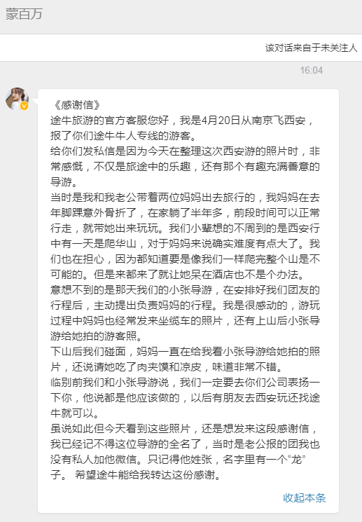 五一假期后,途牛旅游网官微收到一条特别而暖心的感谢信。来信的是一位来自南京的客人傅女士,信中特别感谢的,是途牛西安随往直营地接社导游张继龙。
