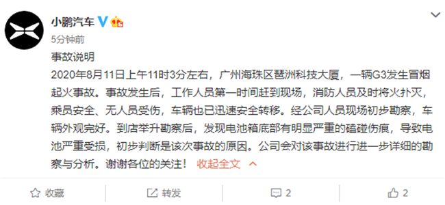 8月11日午时许,有网友在微博爆料,一辆小鹏G3在广州市琶洲一处充电停车场旁发生起火事故,现场还发出两次爆炸声。视频信息显示,当地消防部门已经赶往现场并用水扑救大火,随后,消防人员及时将火扑灭,乘员安全、无人员受伤,车辆也已迅速安全转移。