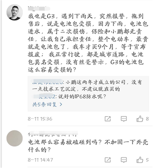 甚至有网友通过自身经历拷问小鹏电池包的稳定性,“我也是G3,遇到下雨天,突然报警,拖到售后,说是电池包受损,因为下雨,电池包进水,属于二次损伤,保险和小鹏都无责任,让我自己承担责任,整个电动车,最贵就是电池包了,车才买9个月,等于宣布报废;我正常行驶,都是城市道路,电池包莫名受损,没有丝毫警示,G3的电池包这么容易受损的吗?”