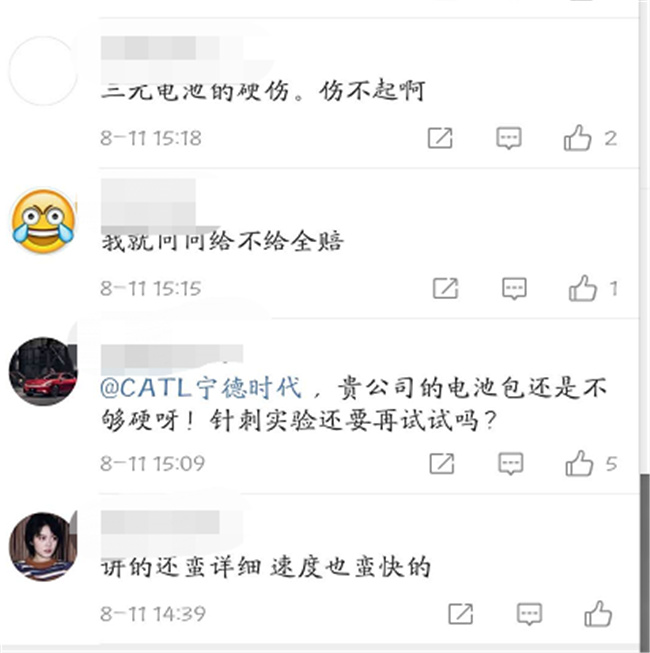 作为电池提供商的宁德时代也被抬了出来,有网友@宁德时代,“贵公司的电池包还是不够硬呀!,针刺实验还要再试试吗”?更有网友挖苦道:“宁德时代之前测试的意思是外壳够硬就没事么”?